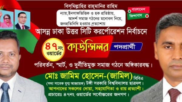 ঢাকা উত্তর সিটি কর্পোরেশন নির্বাচনে ৪৭ নম্বর ওয়ার্ডে কাউন্সিলর পদে প্রার্থী হলেন মোঃ জামিম হোসেন (জামিল) -(নিজস্ব প্রতিবেদক)