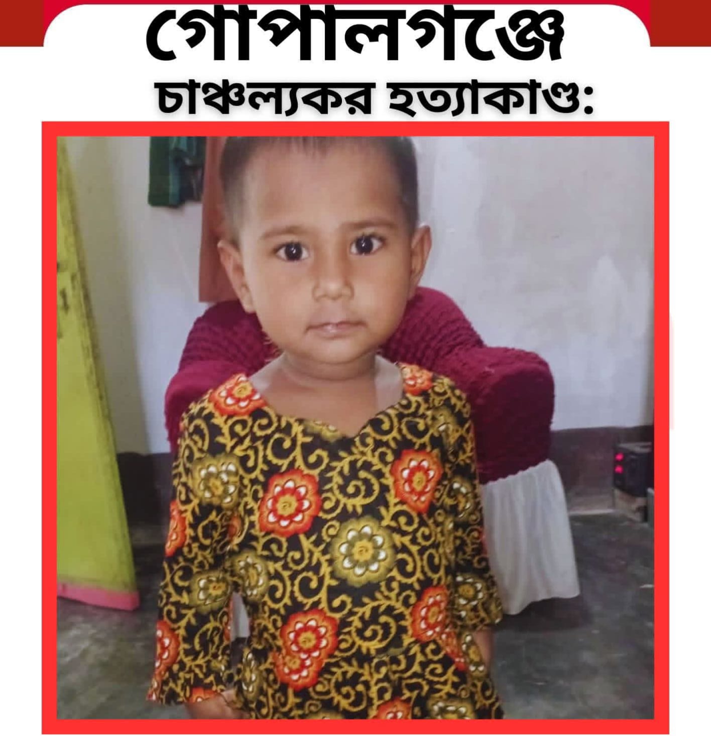 পরকীয়া প্রেমিকের সঙ্গে পালিয়ে গিয়ে ৩ বছরের শিশুকে হ'ত্যা, ১৭ দিন পর ট্রাঙ্ক থেকে ম'র'দেহ উদ্ধার গোপালগঞ্জ সদর উপজেলার গোবরা নীলারমাঠ এলাকায় হৃদয়বিদারক একটি হ'ত্যা'কাণ্ডের ঘটনা প্রকাশ পেয়েছে। পরকীয়া প্রেমিকের সঙ্গে পালিয়ে যাওয়ার আগে নিজের ৩ বছরের শিশু সন্তানকে হ'ত্যা করার অভিযোগে এক মাকে আটক করেছে পুলিশ।