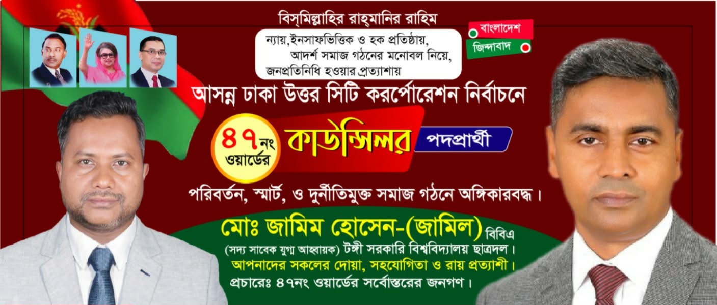 ঢাকা উত্তর সিটি কর্পোরেশনের আসন্ন নির্বাচনে ৪৭ নম্বর ওয়ার্ডে কাউন্সিলর পদে প্রার্থী হিসেবে আনুষ্ঠানিকভাবে নির্বাচনী মাঠে নেমেছেন মোঃ জামিম হোসেন (জামিল)। তিনি পরিবর্তন, স্মার্ট ও দুর্নীতিমুক্ত সমাজ গঠনের প্রত্যয়ে নির্বাচনে অংশগ্রহণ করছেন।
