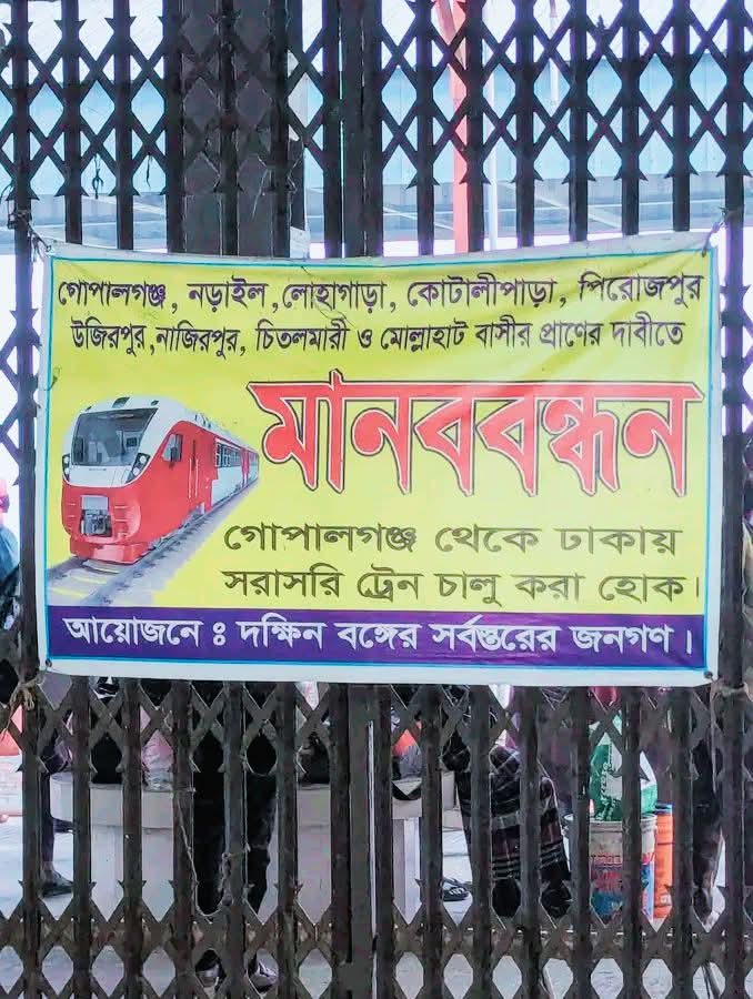 গোপালগঞ্জ থেকে রাজধানী Dhaka-য় সরাসরি ট্রেন চালুর দাবিতে মানববন্ধন কর্মসূচি পালন করেছেন দক্ষিণাঞ্চলের বিভিন্ন জেলার সাধারণ মানুষ।