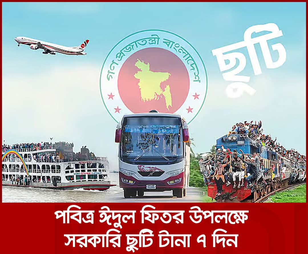 পবিত্র ঈদুল ফিতর উপলক্ষে সরকারি কর্মকর্তা-কর্মচারীদের জন্য টানা ৭ দিনের ছুটি ঘোষণা করা হয়েছে। এতে করে দীর্ঘ ছুটিতে পরিবার-পরিজনের সঙ্গে ঈদ উদযাপন করতে রাজধানীসহ বিভিন্ন শহর থেকে গ্রামমুখী মানুষের যাত্রা বাড়বে বলে ধারণা করা হচ্ছে।
